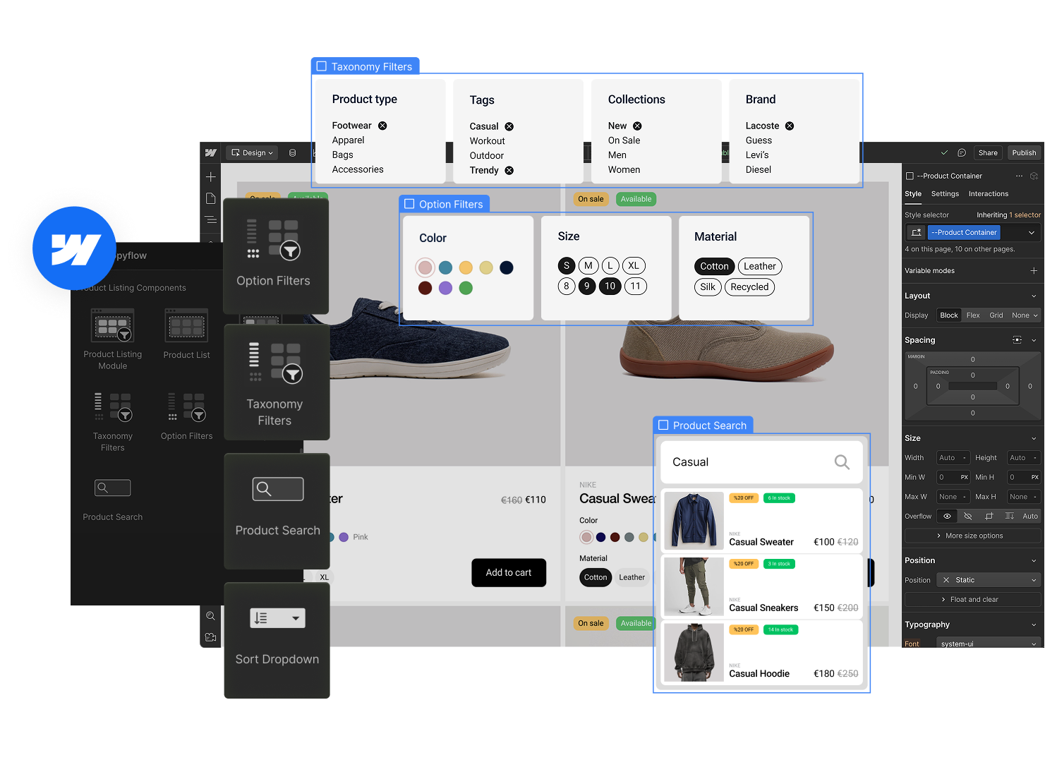 Design tailored search and filter experiences in Webflow, no rigid Shopify templates or expensive third-party apps.
